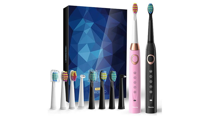 Este es el perfecto juego de cepillo de dientes electrónico para parejas. En el paquete, tendrás dos mangos, ocho cabezales de cepillo, dos estuches de cerdas protectoras y dos cables de carga USB. Los cepillos de dientes en sí tienen cinco modos, que incluyen limpieza, blanqueamiento, sensibilidad, pulido y masaje. Podrás eliminar hasta un 300% más de manchas y placa que un cepillo manual, gracias a las 40.000 vibraciones sónicas por minuto. El dispositivo es impermeable y también tiene un temporizador de dos minutos. Por último, también es genial para viajar, ya que una sola carga dura 30 días, y es compacto y ligero, por lo que no llenará tu bolsa de artículos de aseo.