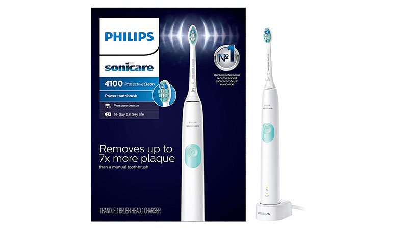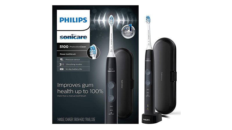 El limpiador protector Sonicare 5100 de Philips ayuda a mejorar la salud de las encías y a proteger los dientes. Este cepillo dental electrónico cuenta con una batería de 14 días de duración, un temporizador de dos minutos con QuadPacer y un recordatorio para cambiar el cabezal. El sensor de presión asegura que no te esfuerces demasiado y puedes seleccionar uno de los tres modos de cepillado. Hay tres modos: limpio, blanco y cuidado de las encías. Por último, la tecnología sónica se mete profundamente entre los dientes para obtener el aliento más fresco y la sonrisa más brillante.
