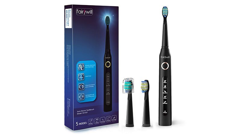 El Cepillo de dientes eléctrico Fairywill tiene un gran poder de limpieza y duración de la batería. Una sola carga de cuatro horas dura 30 días. Selecciona entre cinco diferentes modos de limpieza sónica, incluyendo blanco, limpio, sensible, pulido, masaje, para satisfacer todas las necesidades de salud oral. El temporizador inteligente de dos minutos asegura que no estés perdiendo el tiempo, mientras que el color de las cerdas se desvanece para que sepas cuándo es el momento de cambiar de cabeza. La unidad en sí es impermeable, perfecta para los cepillos de ducha, y el mango es ergonómico y antideslizante. Por último, este cepillo es ideal para viajar, con carga USB y un estuche protector de cerdas.