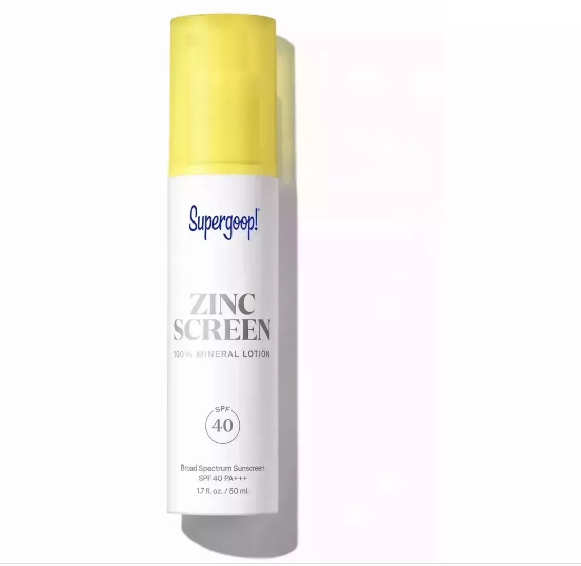 "Me gusta la loción ZincScreen 100% Mineral de Supergoop porque contiene una fórmula de óxido de zinc que ayuda a proteger la piel de los rayos UV, la luz azul, la radiación infrarroja y la contaminación. La fórmula tiene un tinte apenas perceptible con un pigmento que ilumina la piel y que enmascara los activos de la protección solar mineral, por lo que no queda ningún residuo blanco al aplicarla" -Dr. Nussbaum