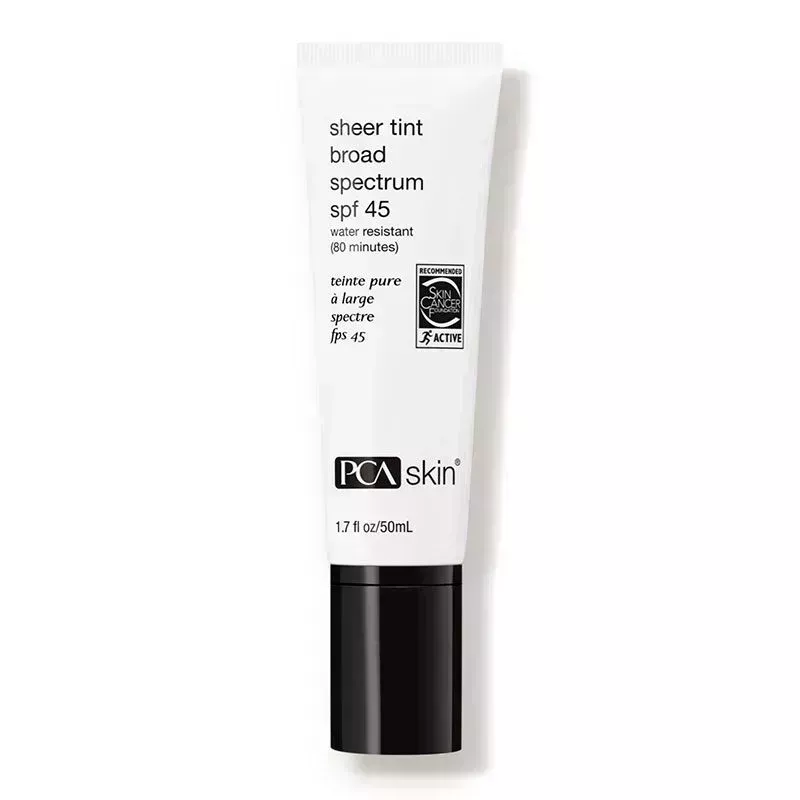 "Otro de mis productos de protección solar favoritos es Sheer Tint SPF 45 de PCA Skin. Ofrece una protección de amplio espectro puramente física con un tinte, por lo que puede usarse solo o bajo el maquillaje. El tono también se adapta a tu piel una vez que lo frotas, por lo que es adecuado para una amplia gama de cutis" -Dr. Spann
