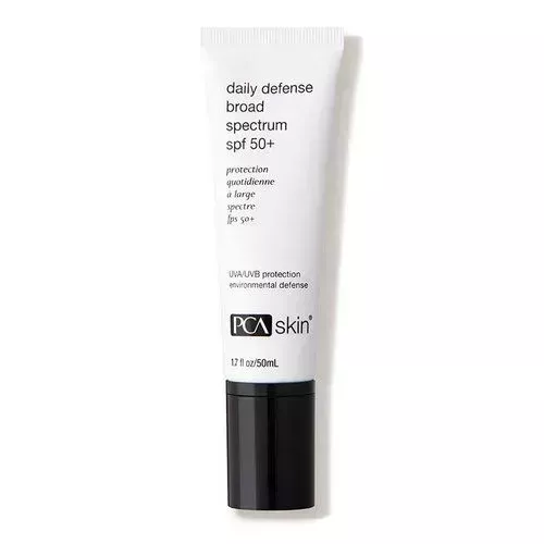 "Otra gran opción para el uso diario es Daily Defense Broad Spectrum SPF 50+ de PCA Skin. Proporciona un amplio espectro de SPF 50+ y también incluye un ingrediente innovador, Ectoin(R), que ofrece protección contra los agresores ambientales como la contaminación. También ayuda a mejorar la función de barrera, que puede verse alterada con la edad y el uso excesivo de productos" -Dr. Spann