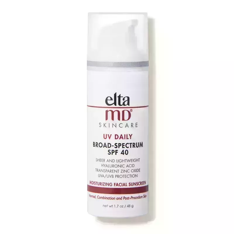 "EltaMD hace excelentes protectores solares con contenido mineral que se frotan en la piel, mientras que muchos protectores solares minerales dejan un tinte blanco. Están hechos con nanopartículas, por lo que son capaces de frotarse más claramente porque el tamaño de las partículas es pequeño. Este también contiene ácido hialurónico, por lo que me encanta recomendarlo a los pacientes con tipos de piel más secos" -Dr. Campbell