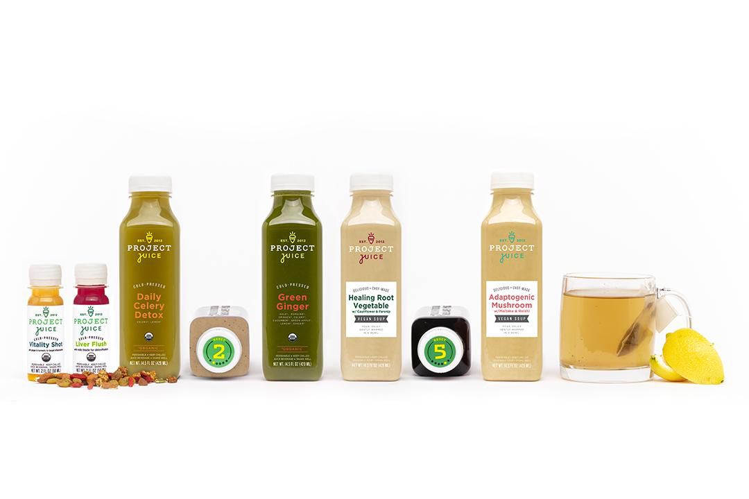 Inscríbete ahora Los limpiadores de zumo orgánico de Project Juice incluyen tres opciones de 5 días, así como la opción de crear el tuyo propio. Las limpiezas incluyen seis jugos por día y, en el caso de The Rejuvenation Cleanse (85 dólares por día), dos chupitos de súper alimentos y dos alimentos: sopa y trail mix.