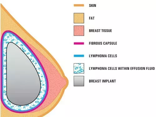 Esquema de BIA-ALCL en una mama con implantes. FDA