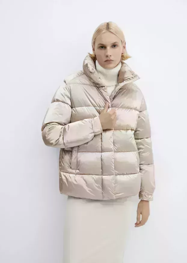 Este abrigo acolchado parece de satén, pero en realidad es un tejido técnico que repele el agua. Es lo bastante elegante para salir por la noche, pero lo bastante práctico para llevarlo a diario.