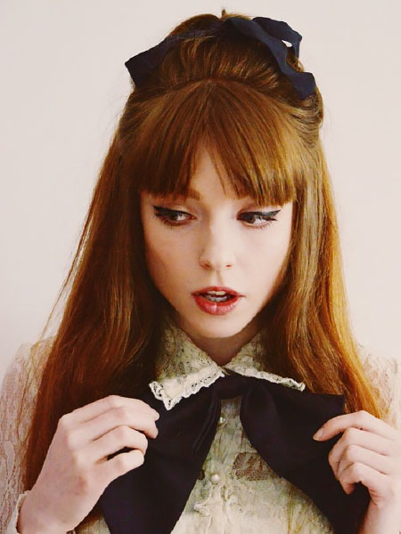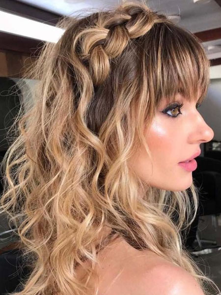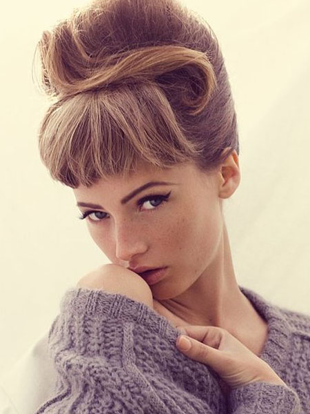 La elegancia inspira este look, para un flequillo contundente combinado con un elegante recogimiento. Con reminiscencias de los años 60, una colmena es un divertido peinado para una noche de fiesta. Separa tu flequillo y recógelo por el momento. Luego, cepíllese el pelo, tan alto como pueda, como si fuera a ponerlo en una cola de caballo. En su lugar, tomarás un elástico y crearás un moño en forma de bucle hacia la punta del cabello. Luego, lo enrollas sobre sí mismo hasta que llegues a tu cuero cabelludo. Coloca el moño en su lugar, y usa alfileres extra para limpiar los lados. Utiliza el mango de un peine seccionador para sacar las secciones suavemente y crear más volumen. Desengancha el flequillo y usa un cepillo redondo y un secador de pelo con fijación direccional para darle la forma correcta. Por último, rocíalo con laca para el cabello para mantenerlo en su lugar.