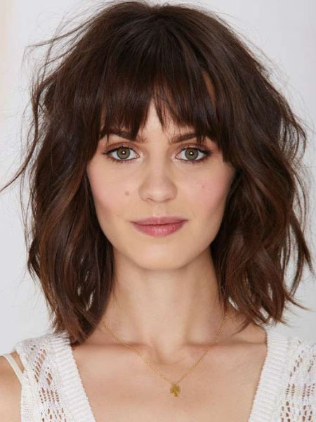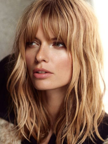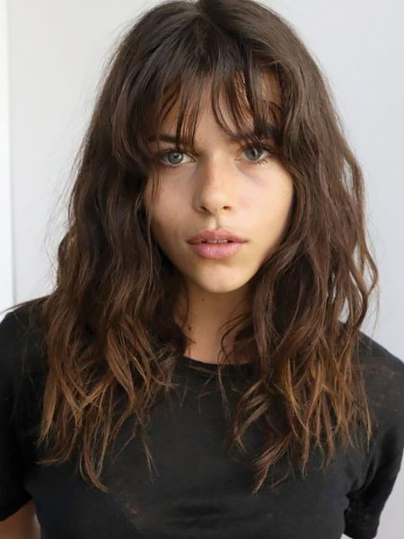 A las damas fáciles les encantará el flequillo natural y desordenado. Este estilo relajado no tiene pretensiones y es genial para los días de ocio. Funciona mejor con el cabello ondulado naturalmente porque ya tiene un poco de forma. Estilizar el flequillo desordenado natural es súper fácil. Pasa un peine de dientes anchos para desenredar y luego añade más textura si sientes que la necesitas. Intenta usar sal marina en aerosol, un poco de laca o tal vez algo de masilla. Combina el look con maquillaje natural, un poco de crema BB y rímel, o simplemente un rostro desnudo para completar el look fácil y natural.