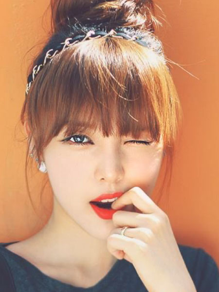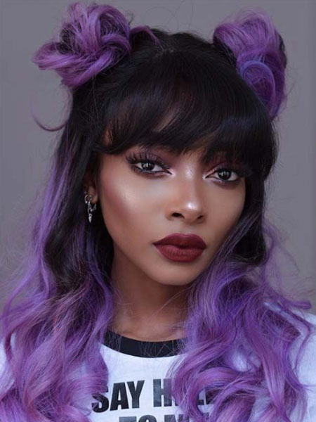 Estilizar los bollos laterales a media altura, con flequillo pesado, es un look lindo y divertido. Puedes llevar esto recto o rizado, lo que te haga cosquillas. Una vez que tu cabello esté listo, secciona la mitad superior de tu cabello. Puedes comenzar la sección en cualquier parte desde las sienes hasta la parte superior de las orejas. Recorta la sección inferior, así como el flequillo. A continuación, divide la parte superior por la mitad en la mitad de la cabeza. Luego, usa el mismo proceso que usarías para los bollos de lado completos. Haga una coleta alta en cada lado, envuelva el pelo alrededor de ella, y asegúrela con horquillas. Suelta el flequillo y la parte inferior del pelo, pasando los dedos o la plancha para conseguir la forma adecuada. Obtendrás puntos extra por mecerlo con el pelo teñido.