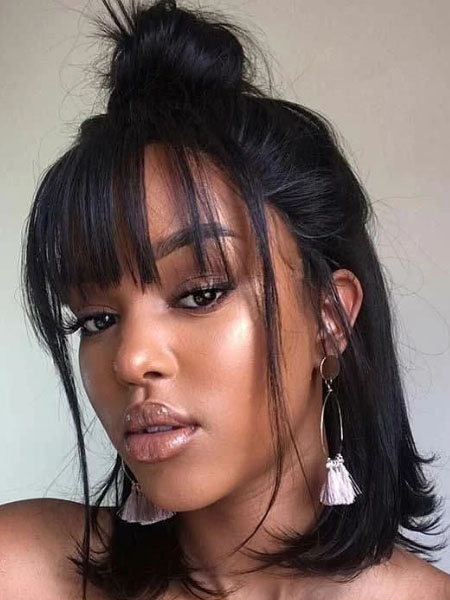 Ve por un look relajado pero sofisticado con un moño medio arriba, medio abajo y flequillo recto. Este estilo se hace mejor con un cabello limpio y fresco. Una vez que te laves y seques, trabaja en todo tu cabello con la plancha. Puedes añadir una pequeña patada en las puntas para algo diferente, o mantenerlo totalmente liso. A continuación, secciona el pelo de la parte superior de las orejas y saca el flequillo. Cepilla el resto de la sección en un nudo suelto. La versión del tramposo consiste en enrollar el pelo con la horquilla, mientras lo enrollas. Alternativamente, puedes hacer una cola de caballo a medias y enrollar el moño flojamente desde ahí. Cepilla tu flequillo hacia adelante, y afloja unas cuantas piezas más largas a cada lado, volviéndolo a enderezar si lo necesitas. Completa este look con un pendiente colgante para darle un toque de glamour.