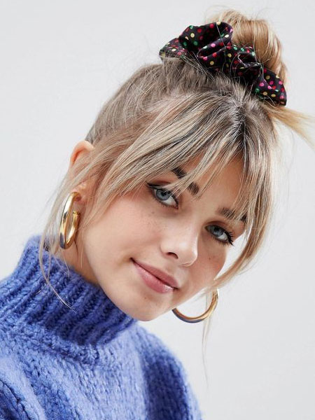 Combina el flequillo de tu cara con un moño para obtener un aspecto bonito y juvenil. Lo bueno de este estilo es que puedes tener cualquier estilo de bollo, desde el desordenado hasta el de una bailarina pulcra. Los bollos también son excelentes para levantar el pelo y quitarte el cuello, especialmente cuando hace calor. Crea un moño desordenado recogiendo tu pelo, y a medida que vayas enrollando el pelo para hacer una cola de caballo, enróscalo con él. Alternativamente, para un moño ordenado, ponte una elegante cola de caballo para empezar. Luego, gire su cabello hasta el final, luego envuelva en círculos alrededor de la atadura y asegúrelo con alfileres u otro elástico. Dale a cada look un acabado divertido, con una linda coleta, una de las mejores repeticiones de la moda de los 90.