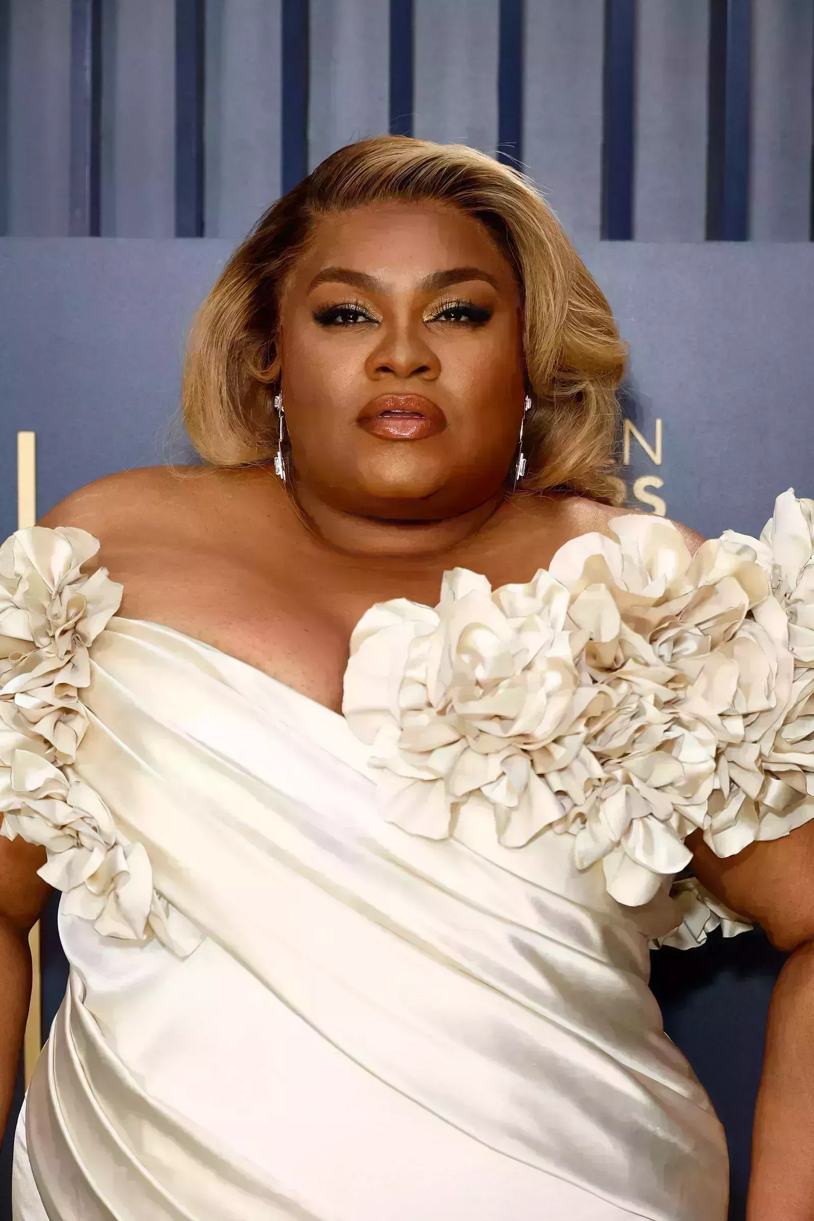 Da'Vine Joy Randolph, ganadora de un trofeo por su papel en The Holdovers, estaba radiante con un recogido rubio suavemente rizado con raya al lado. Un toque de sombra de ojos dorada y un brillo rosado realzaron su brillo de superestrella.