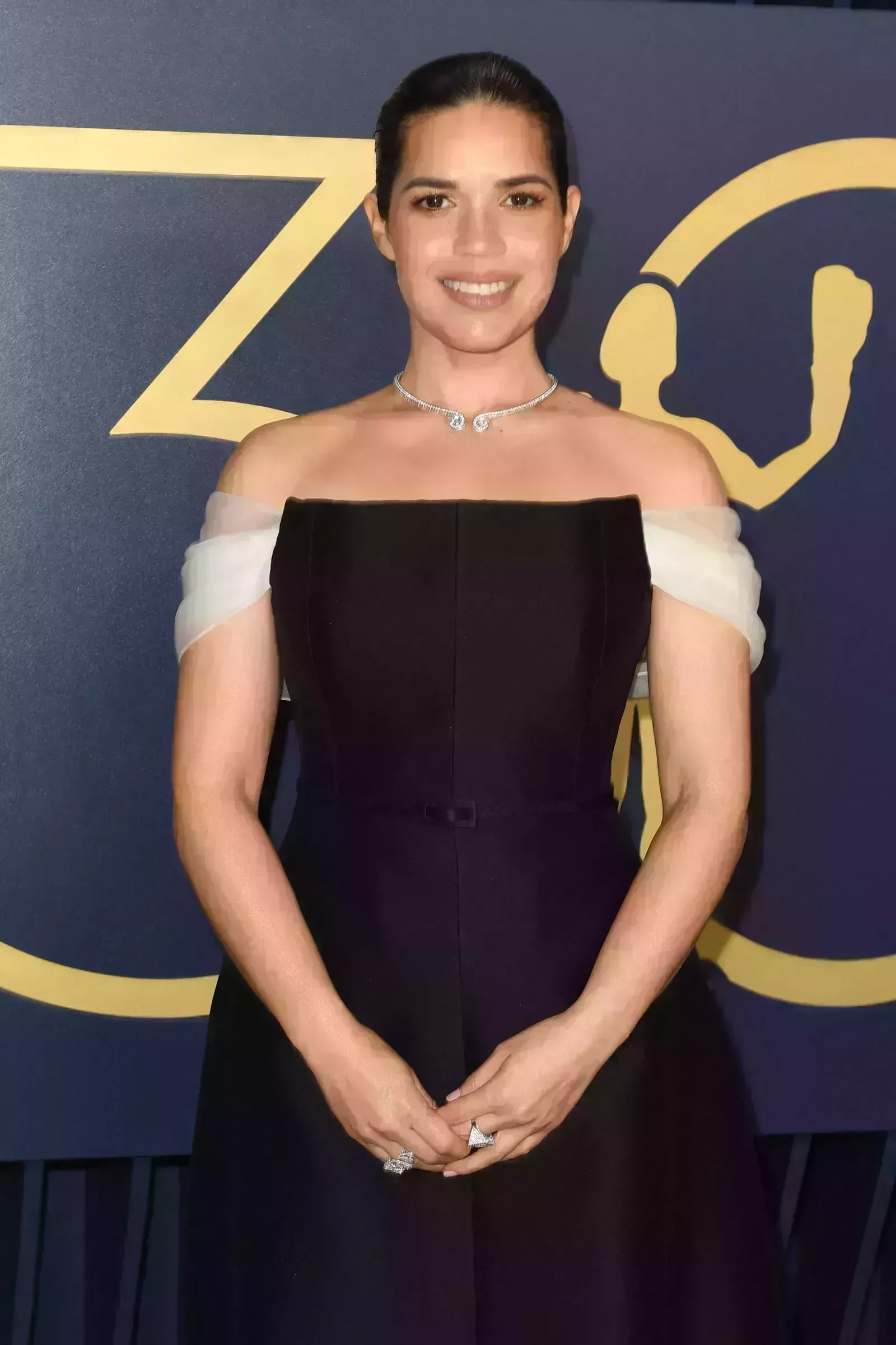 La estrella de Barbie America Ferrera lució el pelo peinado hacia atrás en un moño bajo atemporal, perfecto para su vestido negro de Dior sin tirantes igualmente atemporal. La estilista Aviva Jansen Perea se inspiró en una "francesa chic pero moderna" para este look, y utilizó los productos Kristin Ess para darle vida. Perea preparó el cabello húmedo de Ferrera con Instant Lift Thickening Spray y luego lo secó. Una vez seco, Perea utilizó una plancha en el pelo supercorto de la nuca de Ferrera, y después lo alisó con el rizador de titanio 1 1/4" de la marca. Trabajando en pequeñas secciones, Perea utilizó una varita de máscara de pestañas limpia y una "gran cucharada" de Depth Defining Soft Matte Pomade para cubrir el cabello de la estrella, pasándolo por un elástico y formando un moño sencillo.
