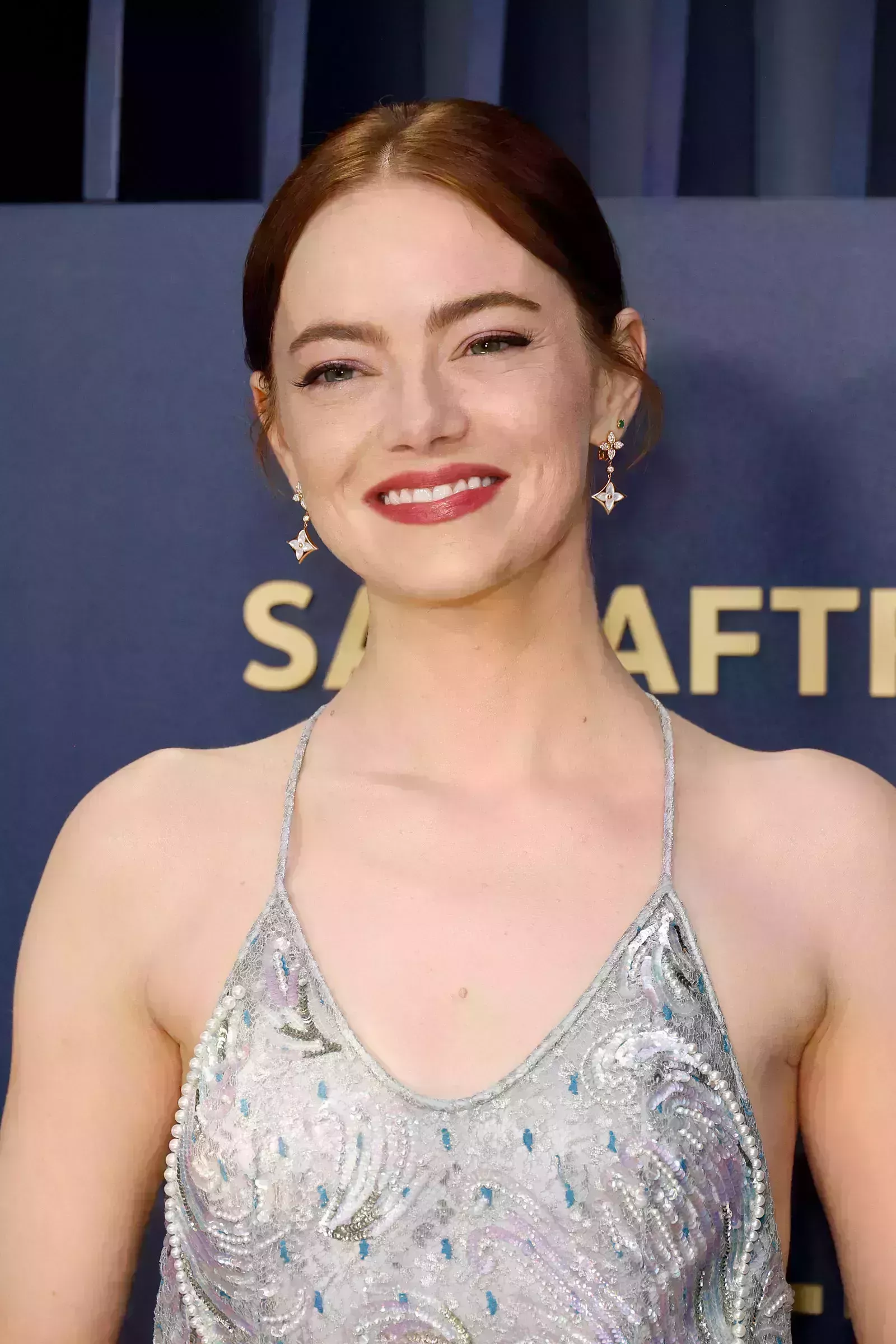 Si te fijas bien, verás que Emma Stone no sólo lleva un labio frambuesa, sino también un delicado tono rosa en los párpados. (Su labial exacto: Charlotte Tilbury Hollywood Beauty Icon Lipstick en Rose to Fame). La peluquera Mara Rozak se inspiró en el vestido de Louis Vuitton con pedrería, creando un "toque muy fresco, juvenil y moderno" para la estrella.