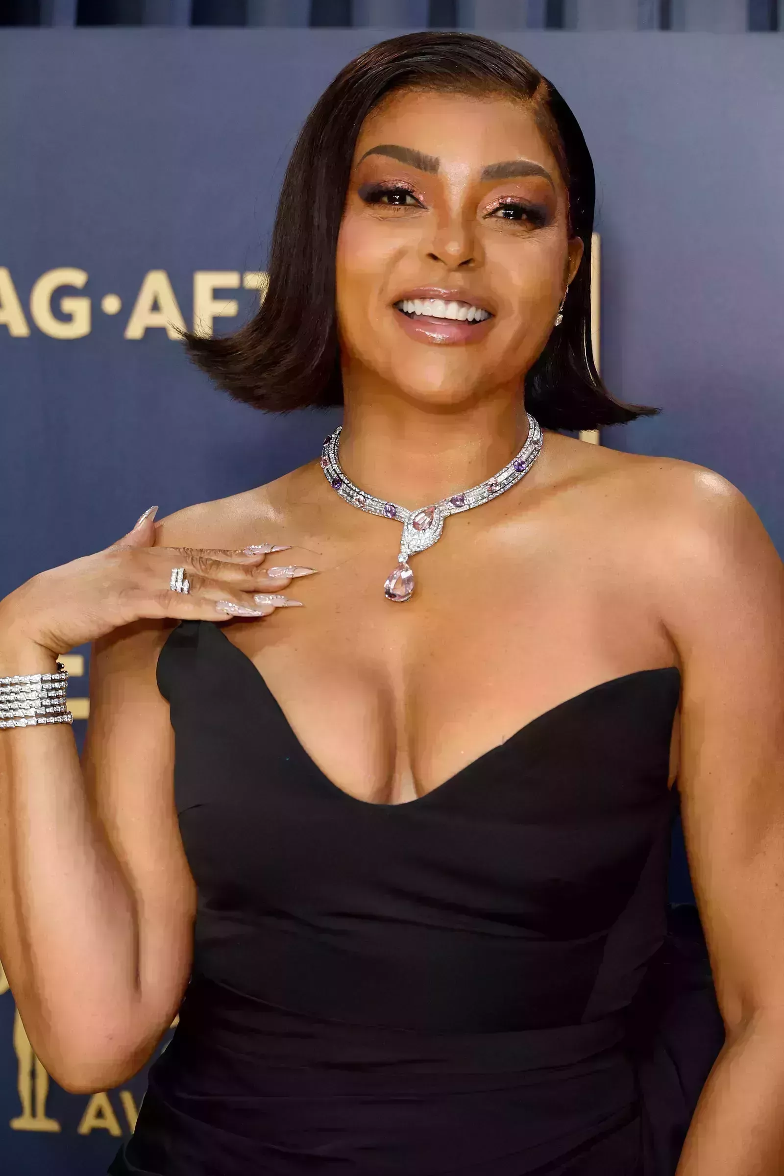 El corte bob continúa su reinado como una de las tendencias predominantes en la alfombra roja para la temporada de premios, y la versión de Taraji P. Henson es preciosa, como de costumbre. Sus brillantes ojos y uñas rosas imitaban las piedras preciosas rosa pálido de su collar serpiente.