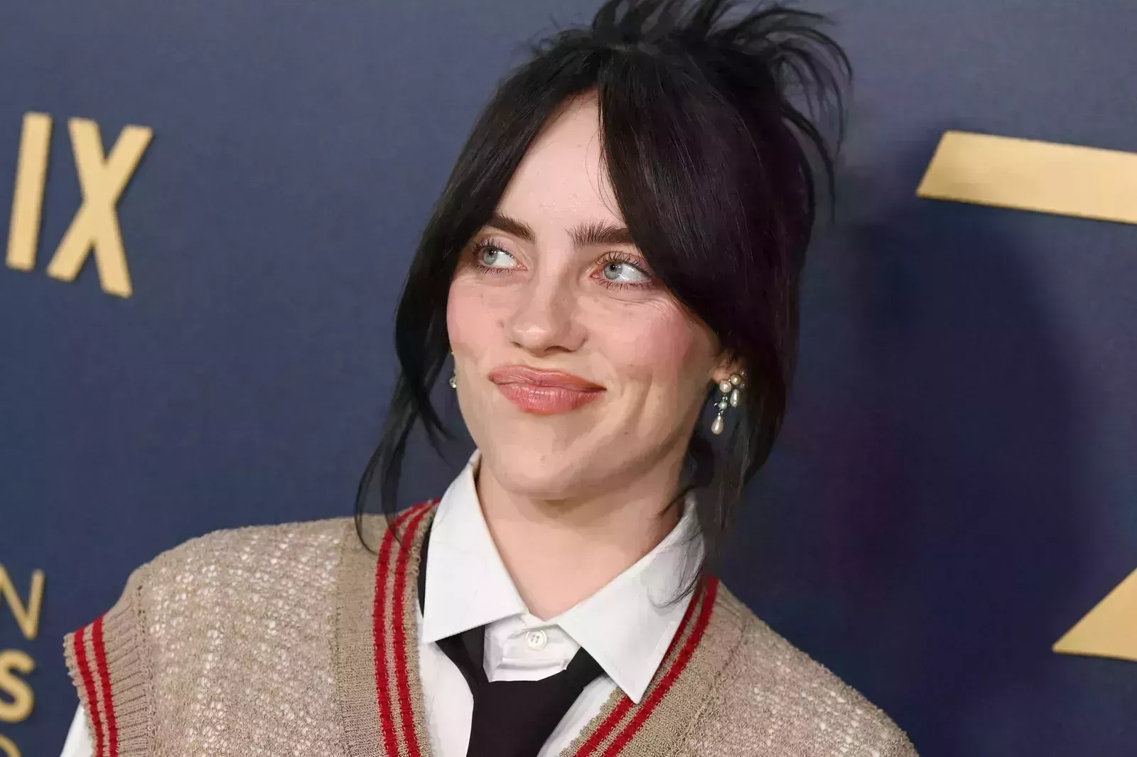 Billie Eilish se ciñó a uno de sus looks característicos, un toque desenfadado con flequillo cortina y un maquillaje minimalista, salvo un colorete rosa chicle y unos labios ligeramente brillantes.