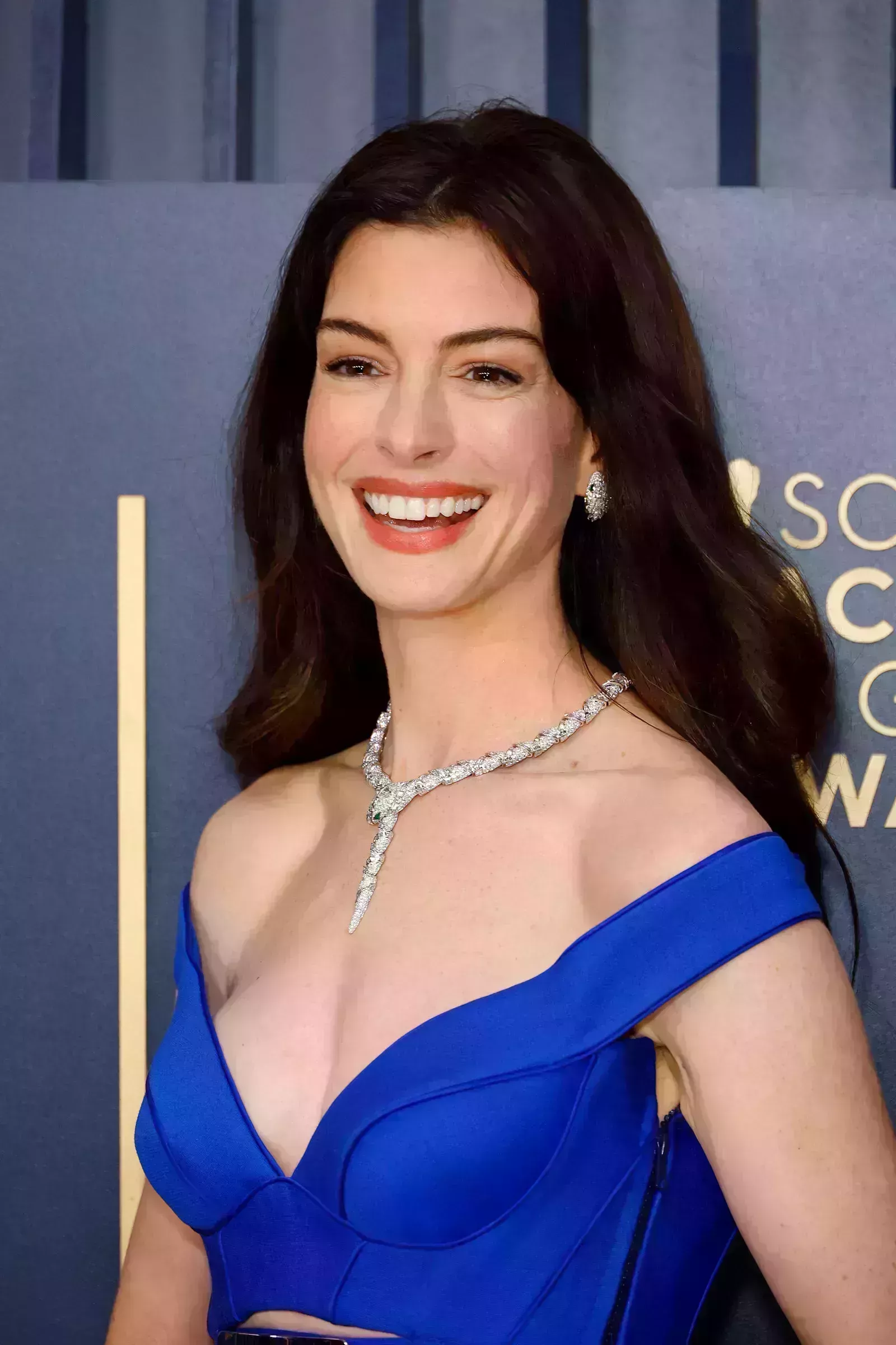 La larga melena morena de Anne Hathaway era abundante, esponjosa y tan deliciosa que básicamente le robó el protagonismo a su collar de diamantes en forma de serpiente y a su vestido azul brillante. El peluquero Adir Abergel preparó el peinado inspirado en las supermodelos de los 90 con Virtue Labs Damage Reverse Serum y Volumizing Mousse, y después lo secó con Shark FlexStyle. Con los rizadores Shark FlexStyle Auto-Wrap Curlers, rizó el pelo en un rizo clásico de barril y lo fijó con horquillas. Una vez frío, lo cepilló con un cepillo Mason Pearson clásico y aplicó el aceite Virtue's Healing Oil para dar brillo, además de Create Texturizing Spray para dar volumen extra en la coronilla.
