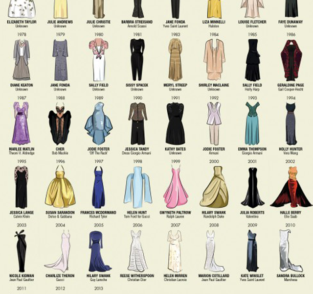 Este poster que recoge los vestidos lucidos por las ganadoras de los Oscar desde 1929 ha sido realizado por MediaRunDigital y en él podemos encontrar desde el Dior de Jennifer Lawrence, pasando por el Valentino de Julia Roberts y el Givenchy de Audrey Hepburn, hasta los primeros modelos que eran de modistos desconocidos. Verdadera historia de la moda hecha gráfico.