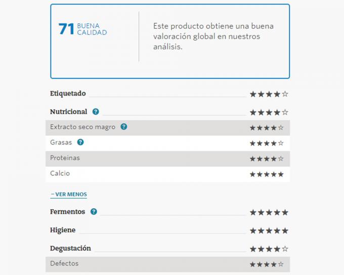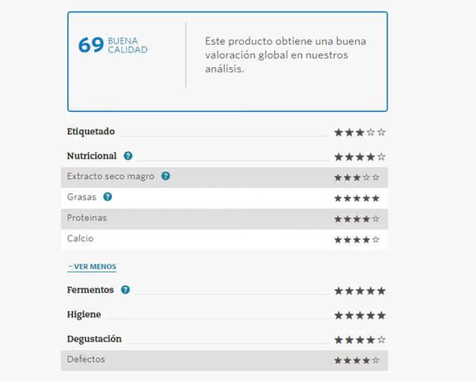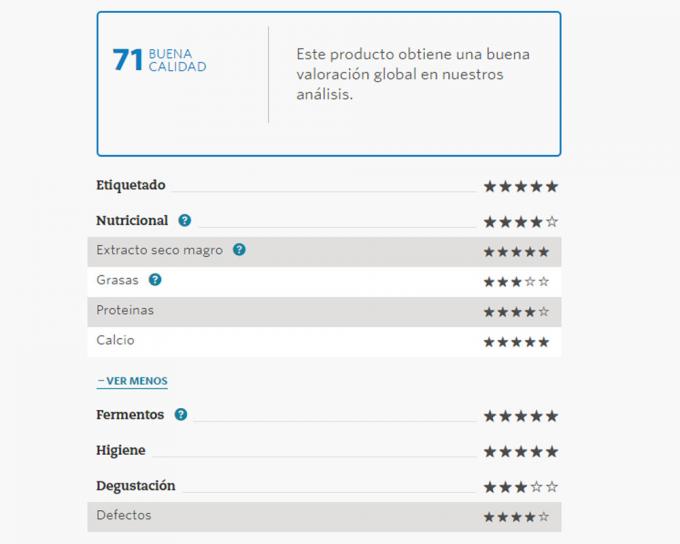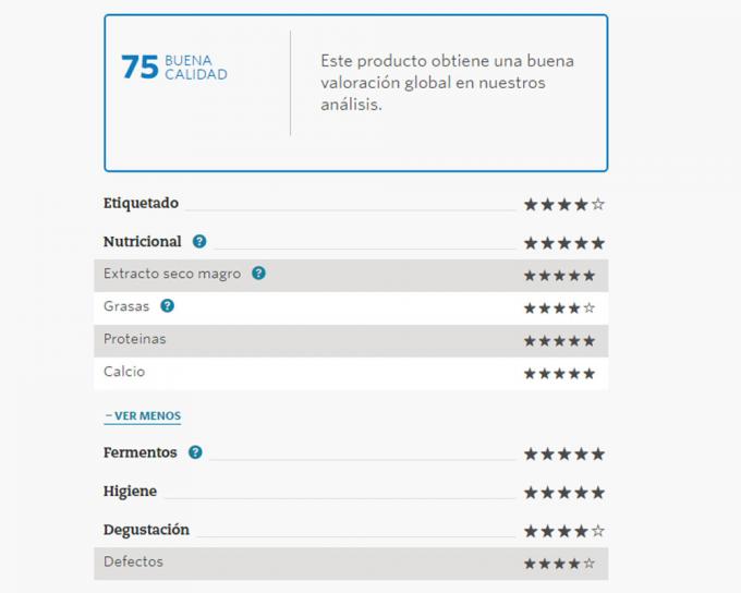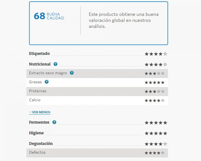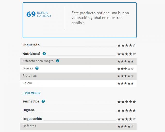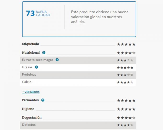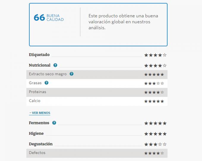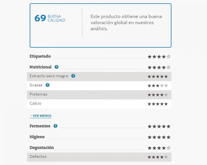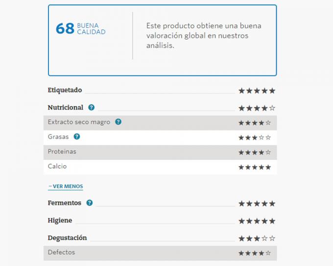 El yogur de la marca Hacendado de Mercadona ha obtenido también una nota de 68 sobre 100 en base a un análisis global del estudio de la OCU. Sus ingredientes son la leche parcialmente desnatada, lactosa, proteínas de leche y fermentos lácticos.