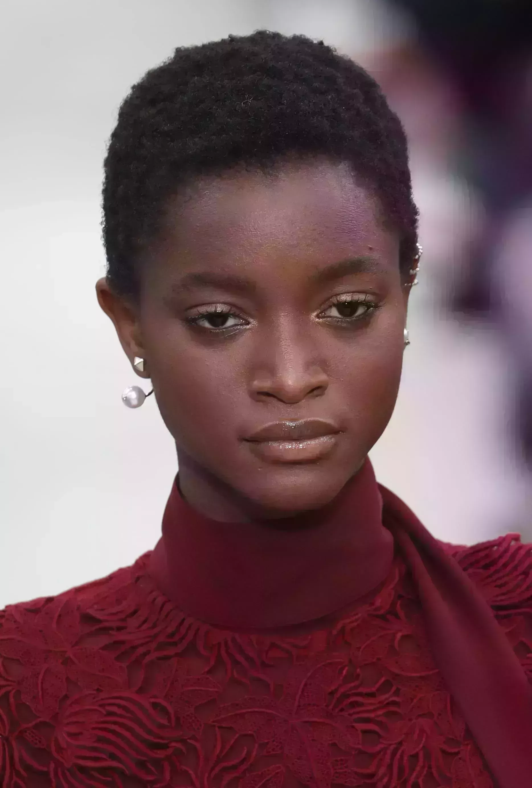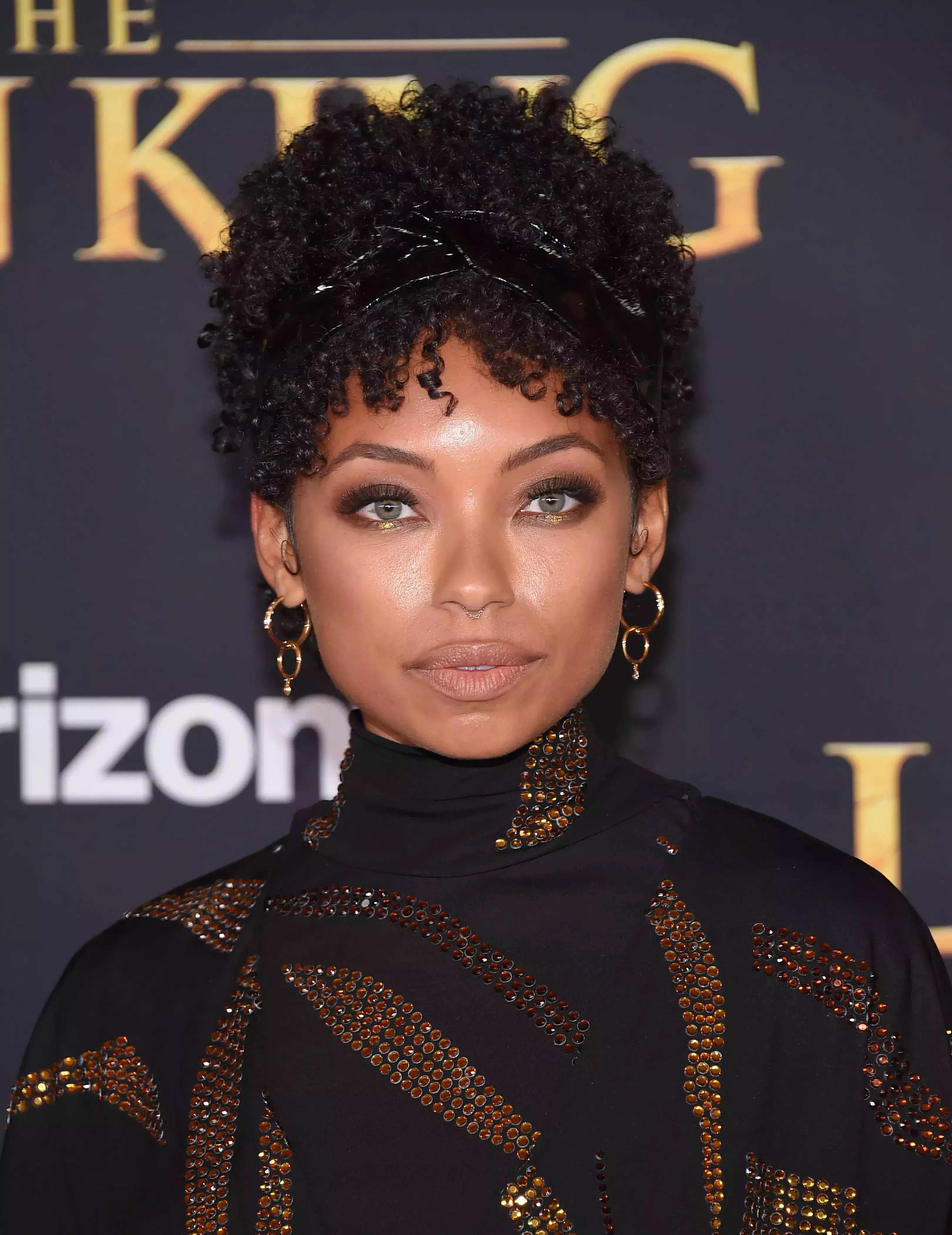 Browning nos muestra cómo lleva sus rizos naturales cortos a la alfombra roja. Recogido en forma de colmena y rematado con una diadema, su pelo parece listo para la fiesta.