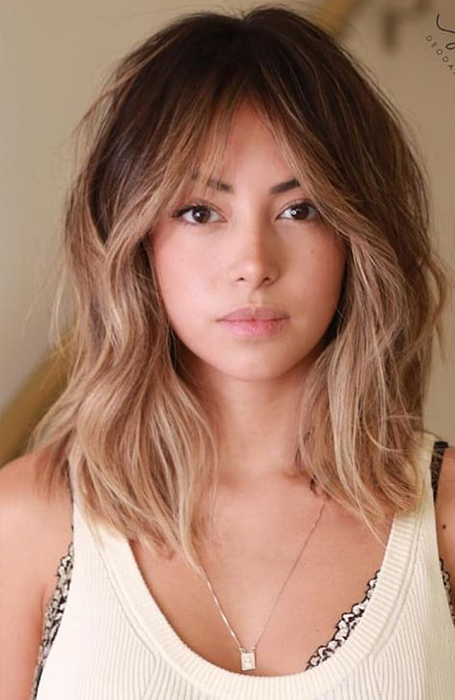 El flequillo Wispy también se conoce como flequillo delgado o "a trozos". Se diferencian del flequillo contundente en que no cubren toda la frente. En su lugar, se despliegan en abanico y crean un efecto más ligero, suave y relajado, especialmente cuando se combinan con el cabello ondulado de longitud media. El flequillo Wispy es adecuado para las personas con cabello fino y delgado, ya que no requieren tanto cabello para crear el flequillo en sí.
