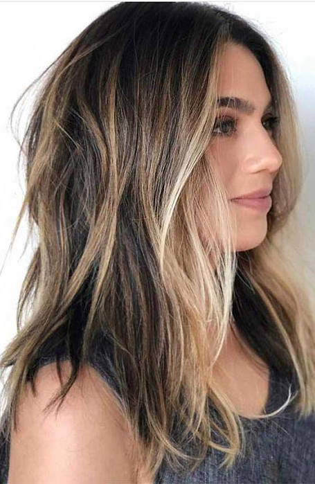 El balayage es una técnica a mano alzada que utilizan los coloristas para crear mechas sutiles y naturales. Inspirado en la forma en que los artistas utilizan la luz, el balayage puede utilizarse para enmarcar el rostro, añadir dimensión y crear movimiento en tu corte de pelo. Un color de base moreno crea el lienzo perfecto para el balayage, y cuando tu cabello es de longitud media, hay mucho espacio para que los profesionales hagan su magia. El resultado es un peinado fresco de California que tiene un aspecto relajado y vivido.
