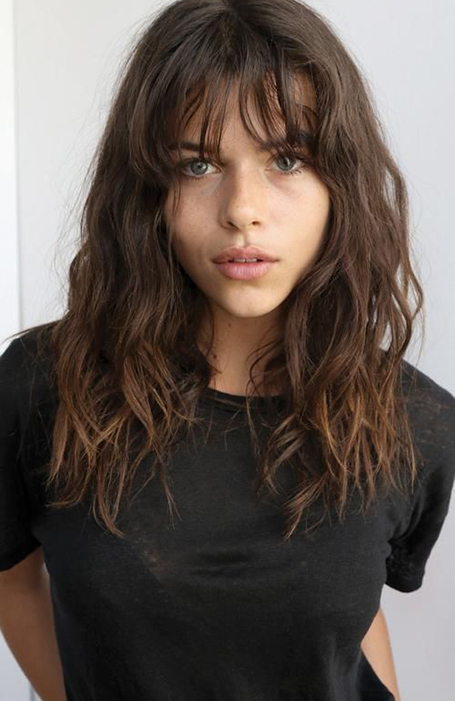Los flequillos en capas dan a tu corte de pelo más movimiento que un flequillo romo y enmarcan tu cara de forma hermosa. Combínalos con el cabello ondulado de longitud media para crear un look relajado y de playa. Los productos texturizantes, como el rocío de sal marina, son esenciales y se suman a la relajada y fría sensación de California. El resultado final da un sutil guiño al corte shag de los años 70 pero con un toque moderno.
