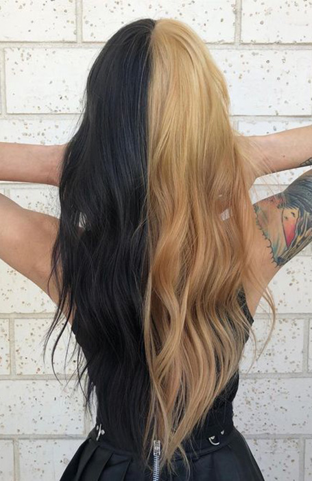Una perspectiva aún más extrema de la tendencia del cabello rubio y negro es el cabello mitad rubio, mitad negro. En lugar de simplemente decolorar algunas secciones de su cabello, la mitad de sus mechones se aclararán y la otra mitad se dejarán oscuros. No para los pusilánimes, la mirada atrevida y llamativa le hará ganar cumplidos!