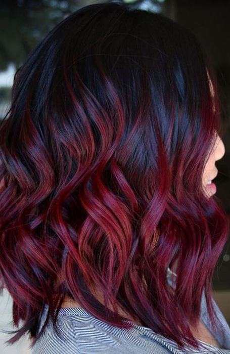 El pelo negro y rojo es una de las combinaciones de colores más populares. Eso es porque es llamativo y atrevido, y aún así se puede llevar todos los días. Para un acabado más dramático que le permita destacar entre la multitud, opte por un rojo tomate más brillante. Mientras tanto, el color caoba y el rojo cereza mantienen el aspecto ligeramente más informal, al tiempo que siguen mostrando su personalidad.