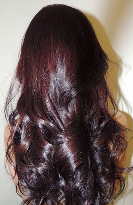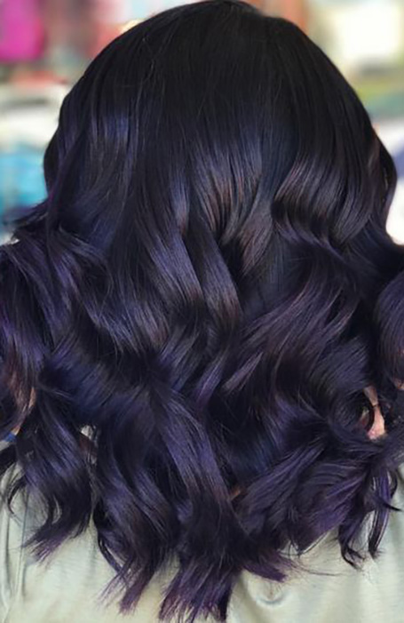 También llamado ciruela negra o berenjena, el cabello negro-morado mantiene la sensación sofisticada del cabello negro pero añade un sutil toque. Lo suficientemente versátil como para llevarla al trabajo o a un festival, se adapta a aquellos con un tono de piel naturalmente claro y de tonos neutros a fríos. Si eres morena con ojos azules, es casi seguro que te halagará. También funciona bien en aquellas personas con piel profunda y trasfondos fríos.