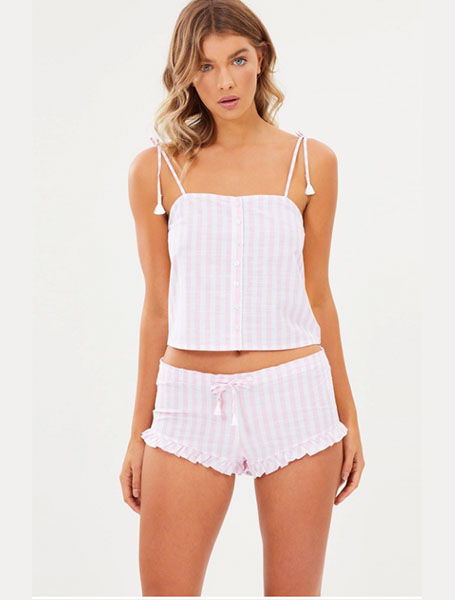 Manténgalo lindo y elegante con este Tilijay Coco cami. Este juego de rayas está disponible en dos colores, y es tan dulce como un bastón de caramelo. Los pantalones cortos con volantes son de tamaño micro, pero te hacen sentir libre a cada paso. La camisola ofrece correas ajustables con una borla al final, y los botones de la parte delantera añaden un toque sexy. Dormirás como una reina cada vez que te pongas este magnífico pijama y nunca querrás quitártelo.