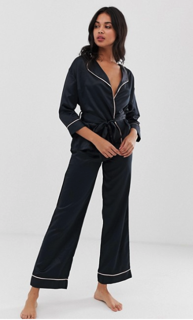 Es sedoso, es hermoso sin esfuerzo, y es sensual, ¿qué más se puede pedir? El juego de pijamas de Bluebella Wren presenta una tela de satén con una seductora cintura de corbata de kimono. El diseño clásico de azul marino con ribetes blancos ofrece una sensación atemporal y al mismo tiempo moderna. La banda elástica alrededor del pantalón te mantendrá cómodo y las piernas anchas te darán una sensación de alta costura.