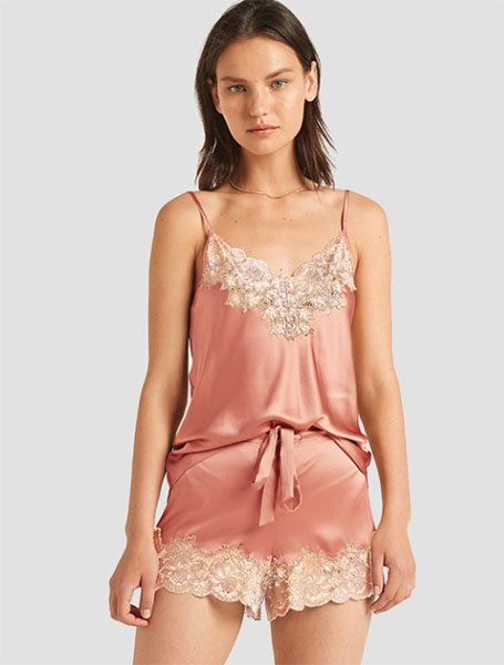 Añade un toque femenino a tu vestuario con este juego de Ginia Cami. La camisola clásica de inspiración francesa tiene un delicado encaje en el escote, con florituras a lo largo del dobladillo de los pantalones cortos. El pijama está cortado en un suave y ligero satén que te mantiene fresca y encantadora mientras duermes. El corte sesgado de la parte superior se desliza elegantemente por tu pecho para dar el toque final perfecto. Elige entre tres colores impresionantes, y serás la próxima bella durmiente.