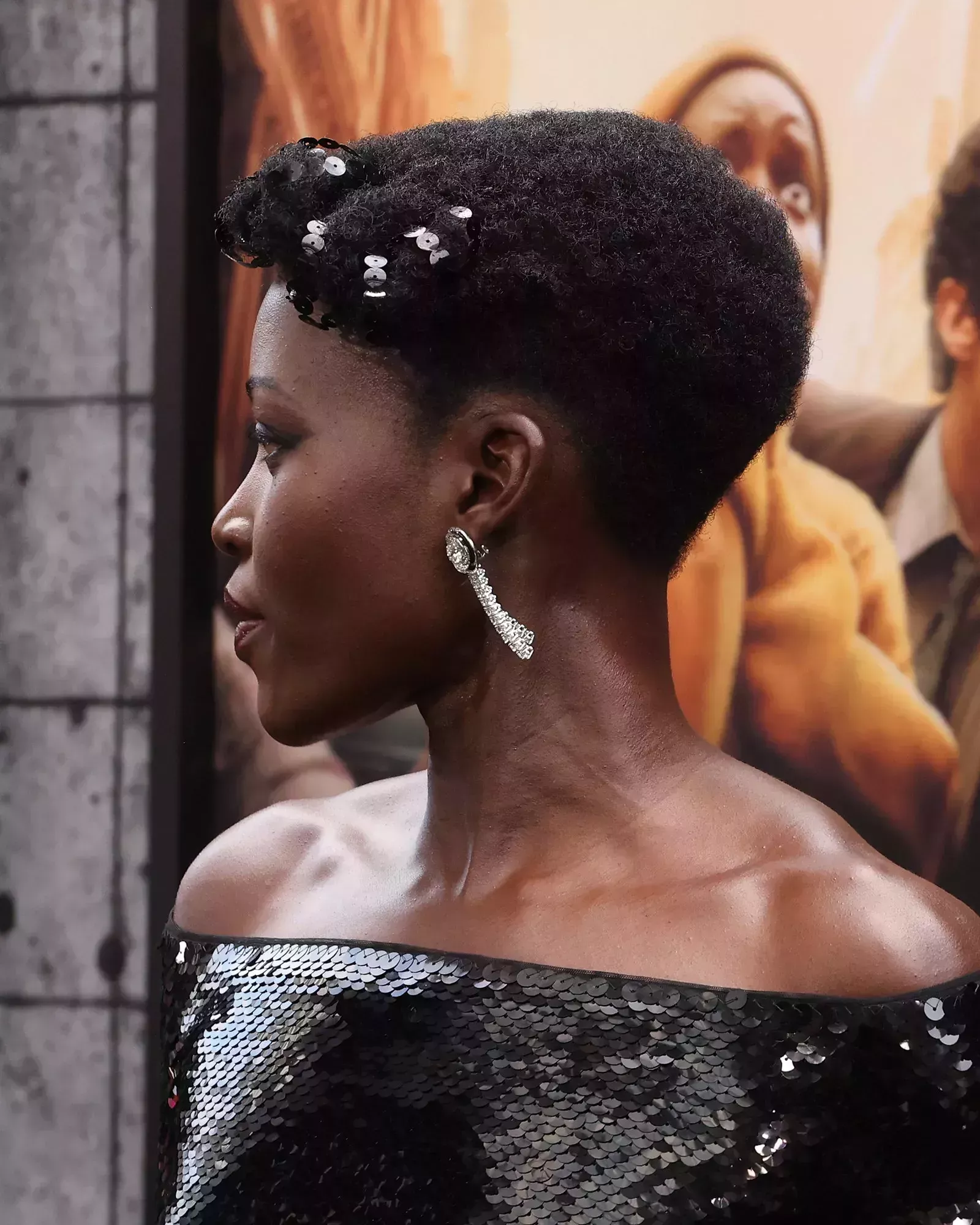 El peinado de Nyong'o, corto y con raya profunda, recibió más volumen a lo largo de la línea del cabello en forma de "flequillo afro", como lo llama François. Y allí, en su textura natural, había delicados bucles de más lentejuelas negras, creando una dimensión preciosa y brillante y el mejor tipo de look a juego.