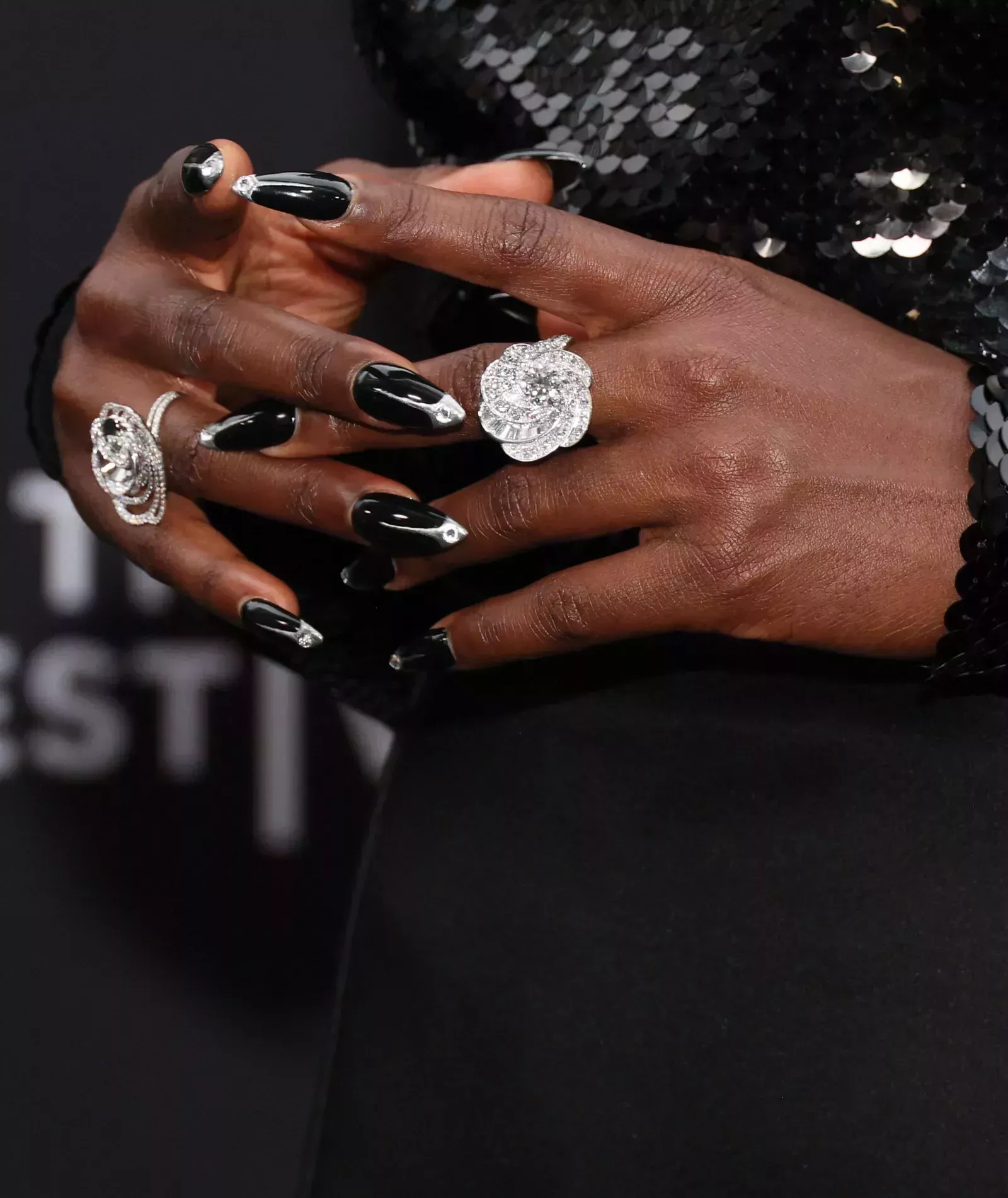 Y justo cuando pensábamos que no podíamos apartar los ojos de su pelo, nos fijamos en las uñas de Nyong'o. Y teniendo en cuenta que las manicuras han dado un giro muy discreto últimamente, nos ha sorprendido de verdad ver un nail art asombroso. El diseño retrofuturista presenta una base negra brillante, puntas plateadas y una gema en forma de diamante en el extremo cónico.