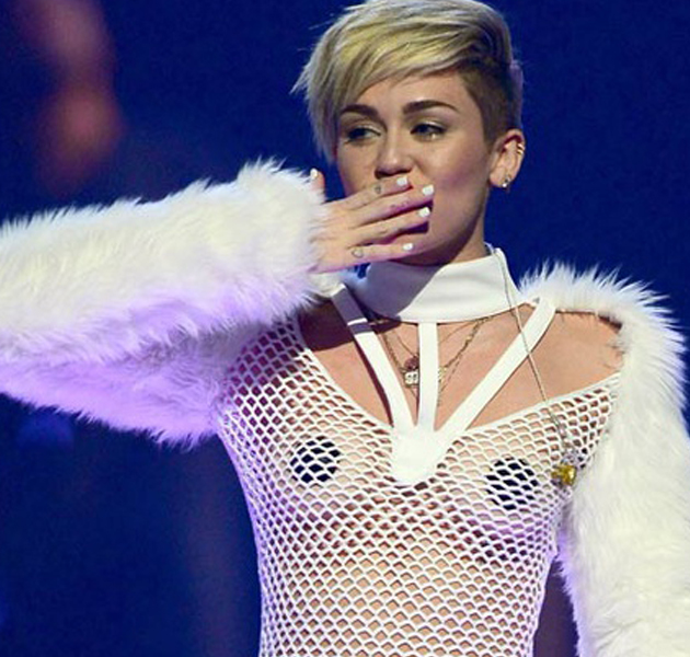 Miley Cyrus causó un gran revuelo con su look de Maria Ke Fisherman, compuesto por un vestido de red tejida a mano blanco, con mangas de pelo blanco. Para no enseñar lo que no debía, Miley se puso debajo unas pezoneras negras y unas braguitas con tiras blancas y negras.