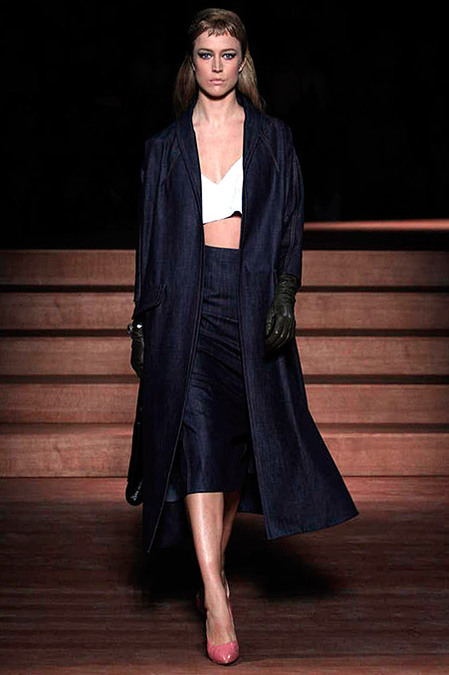 Miuccia propone abrigos largos de piel, napa, muchas estolas de piel (esta parece una prenda hit para ella tras lo visto en sus dos colecciones), capas, faldas lápiz, guantes largos (en serio, que esto debería de ser una colección de primavera), y ninguna prenda tuvo una largura más allá de por encima de la rodilla.