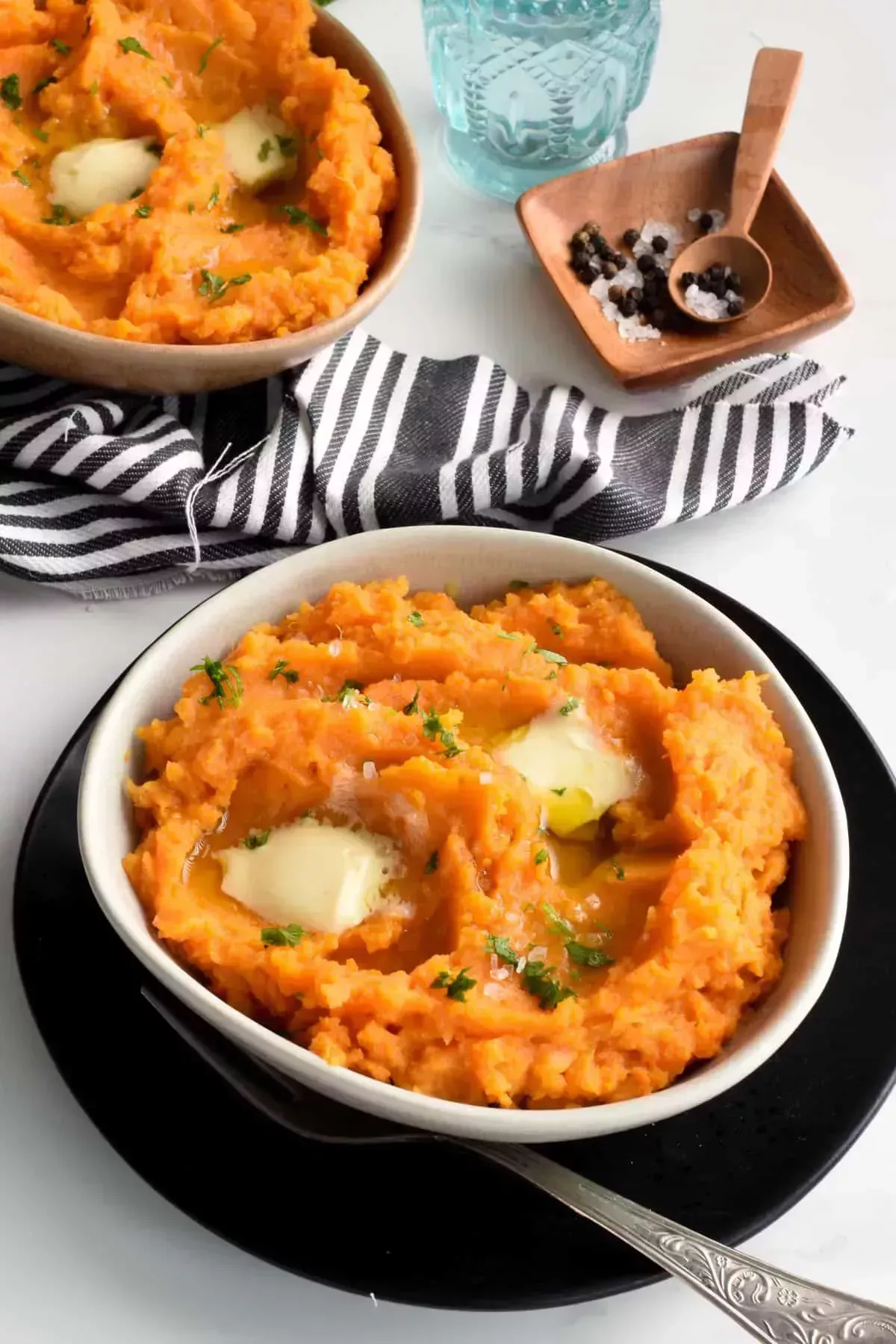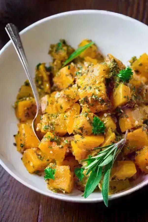 Este plato se elabora con unos pocos y sencillos ingredientes y es súper cremoso, suave y sabroso. También es libre de productos lácteos y de gluten, y el magnífico tono naranja vibrante es perfecto para su mesa festiva.