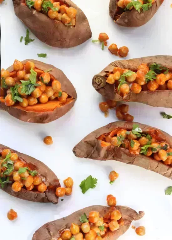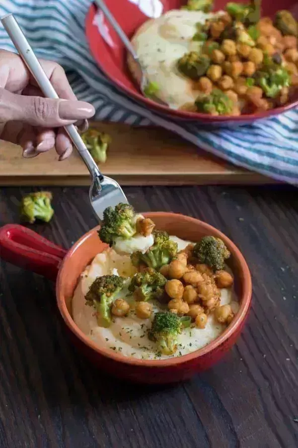 El cremoso puré de patatas acaba de ser renovado con este plato, gracias a los garbanzos con sriracha a la barbacoa y al brócoli.