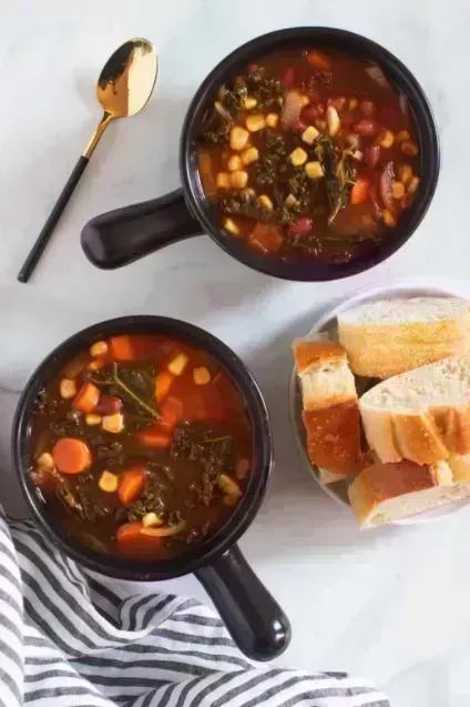 Utiliza tu olla de cocción lenta para crear esta deliciosa sopa digna de un primer plato, que está hecha con col rizada, cebollas, maíz, zanahorias y alubias rojas.