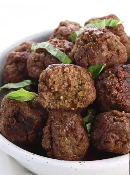 "Vegano" y "albóndigas" no parecen ir exactamente juntos, pero esta versión utiliza lentejas como base, junto con ingredientes que elevan el sabor como las nueces, la salsa de soja y los tomates secos.