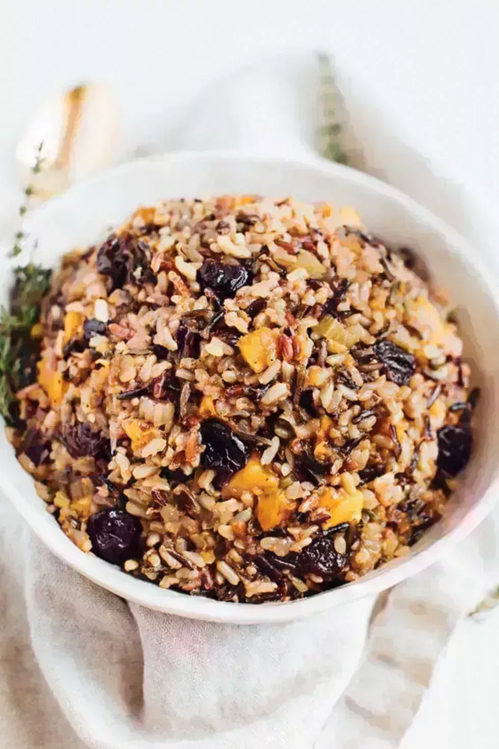 Este delicioso plato tiene todos los ingredientes habituales del relleno -apio, cebolla, salvia y tomillo- pero sustituye el pan por arroz salvaje para darle un toque más saludable. Los arándanos secos también añaden un agradable toque dulce y ácido.