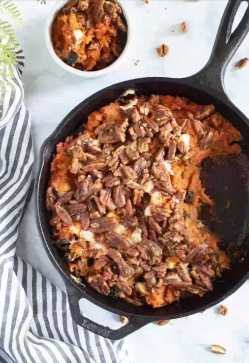Cubierto con nueces y malvaviscos veganos, este dulce giro vegano a una guarnición tradicional lo es todo.