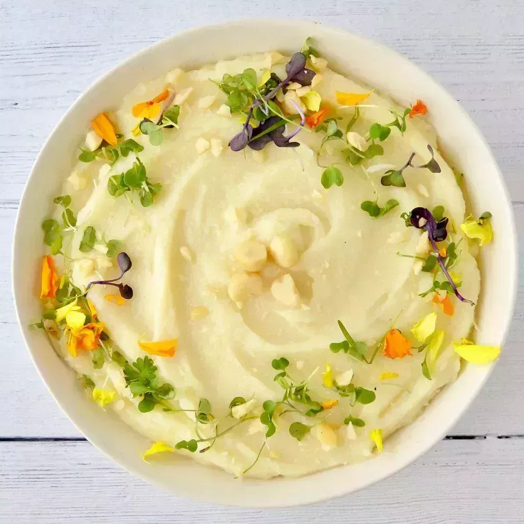 Nada dice más de Acción de Gracias que un gran montón de puré de patatas. Esta versión vegana está hecha con leche cremosa de nueces de macadamia. Es tan sedoso y suave que los invitados pedirán una segunda cucharada.