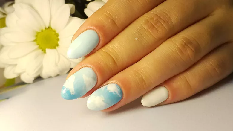En general, las manicuras en gel duran más que el esmalte regular, ofreciendo un acabado hermoso y brillante. Después de dejar curar tu capa base bajo una luz UV, finaliza con el detalle de las nubes.