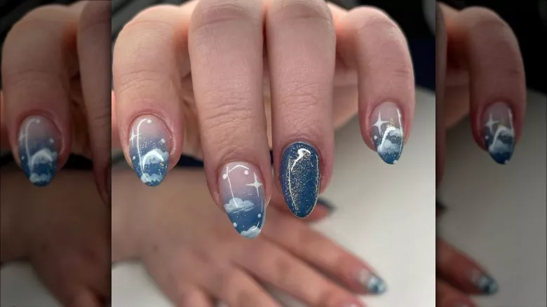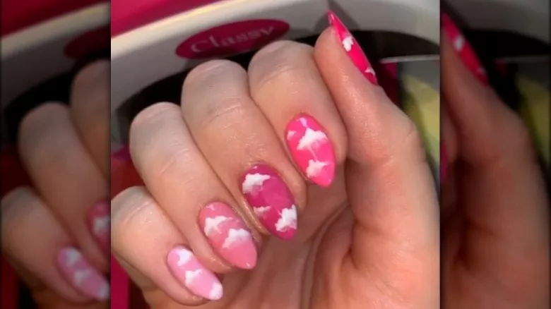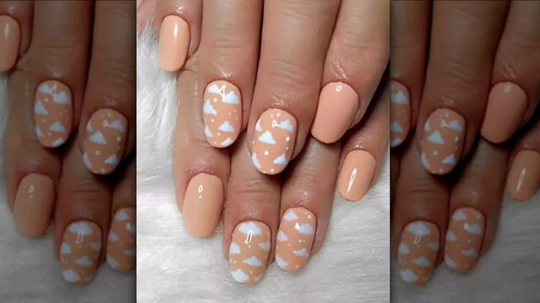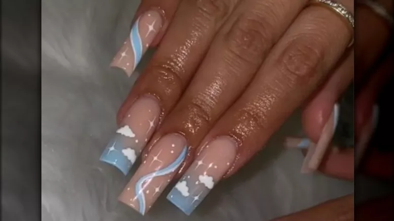 A continuación, Courtney Nicole, dueña de FX Nail Studio, sugiere usar un bolígrafo de gel y un pincel pequeño para pintar las nubes. "Tengo que dibujar la base de las nubes, luego comenzar en el punto más alto de la nube y trabajar hacia abajo a los lados".