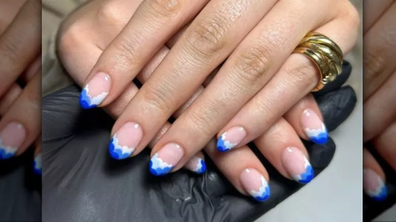 Aunque siempre hay versiones en constante cambio, las manicuras de punta francesa nunca pasan de moda. Para crear puntas inspiradas en nubes, comienza con tu esmalte azul favorito. Aplica una capa de tu primer color en la punta de tu uña, usando el lado del pincel para esbozar la forma.