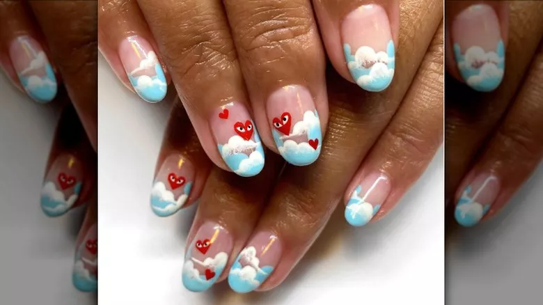 Para un giro único en el tradicional corazón, puedes utilizar el logo del corazón de Comme des Garçons para acentuar tu manicura de nubes.