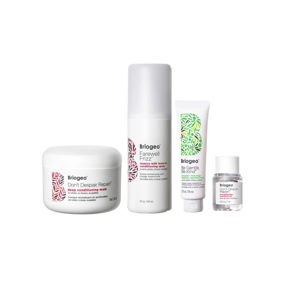 El Briogeo Healthy Hair Wonders Set es otra increíble elección para el cuidado del cabello porque incluye un bote de tamaño completo de Don't Despair, Repair! Deep Conditioning Mask, que ha ganado tres premios Readers' Choice durante tres años consecutivos. Es una hazaña impresionante. Una mezcla hidratante de aceites de rosa mosqueta, almendra dulce y aguacate hidrata en profundidad, suaviza y fortalece tu cabello sediento y quebradizo en sólo 10 minutos y hasta dos veces por semana. También se incluye un spray acondicionador sin aclarado de leche Farewell Frizz, que calma el encrespamiento y la falta de brillo en los días más calurosos. Además, hay dos productos en tamaño de viaje, la mascarilla capilar Be Gentle, Be Kind Avocado + Kiwi Mega Moisture Superfood Mask y el aceite reparador de puntas abiertas Don't Despair, Repair! Strengthening Treatment Oil, para suavizar e hidratar aún más el cabello.
