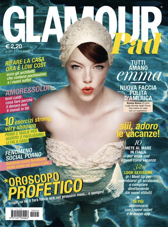Con el calor tan insoportable que estamos pasando estos últimos días, nos apetecía toparnos con una portada así de refrescante, en la que la actriz de moda, Emma Stone, nos invita a que nos demos el baño más retro de la temporada.